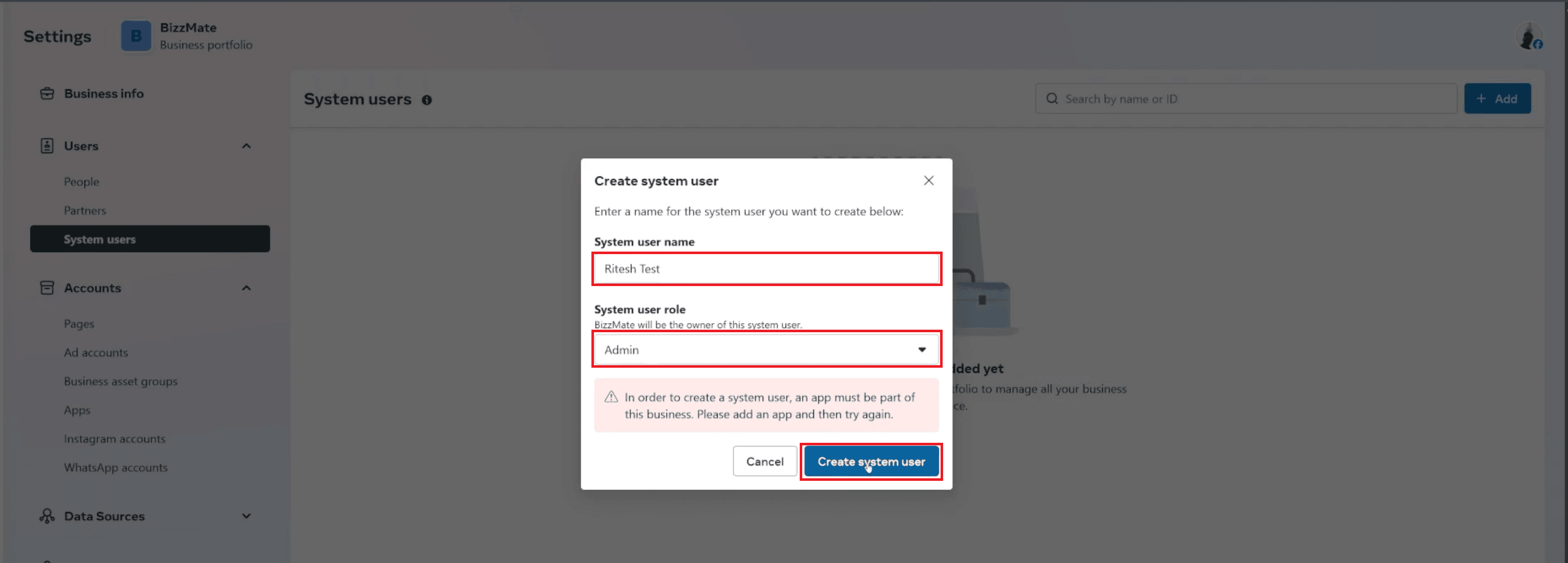 It's common to encounter a message stating that “in order to create a system user, an app must be a part of this business.” If you see this, don’t worry. This simply means you need to create your Facebook App and associate it with your Meta Business Account first. You can then return to this step to complete the system user creation after your app is set up (proceed to Step 3). This is a normal part of the integration process and ensures a secure, seamless data flow between Meta, n8n, and your WhatsApp Business Cloud API setup.