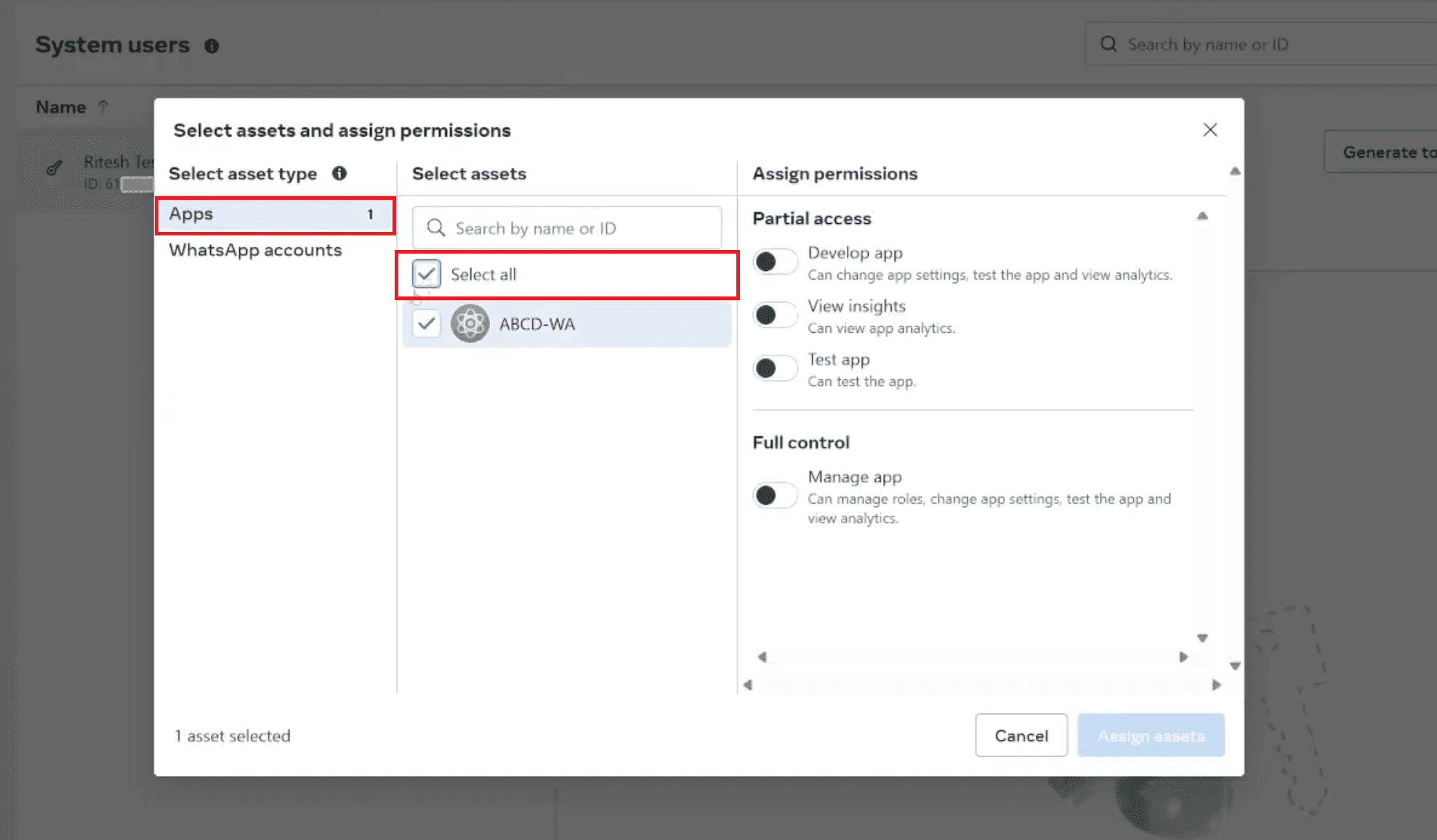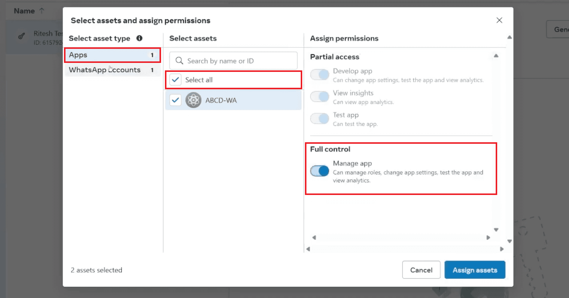 Assign App Control: Select your WhatsApp app (e.g., "ABCD-WA"). Under Assign permissions, ensure you grant Full control (Manage app) for your app.