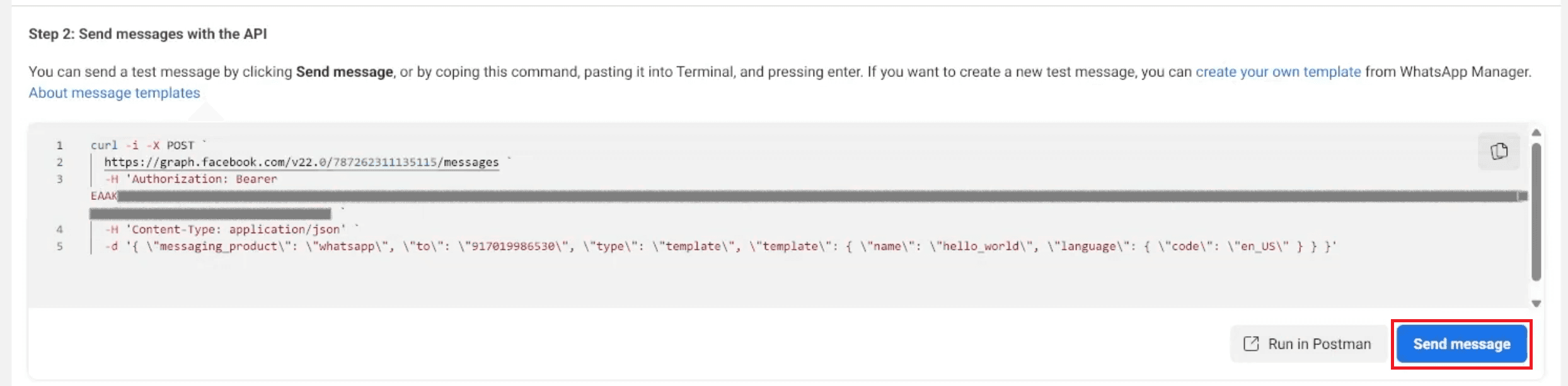 This page is crucial as it displays your Temporary Access Token, the WhatsApp Business Account ID, and the Phone Number ID, which are all needed to send your first test message.