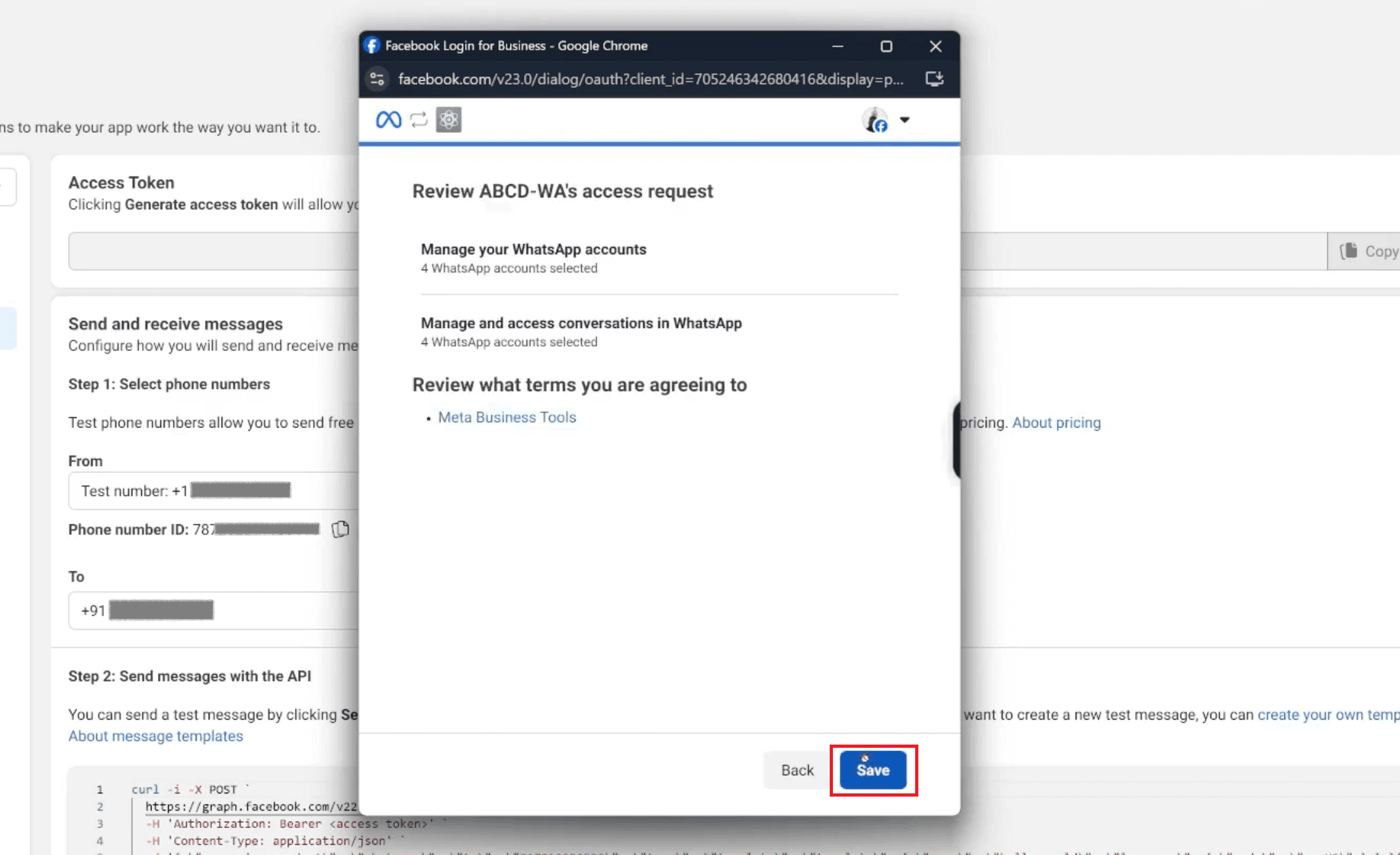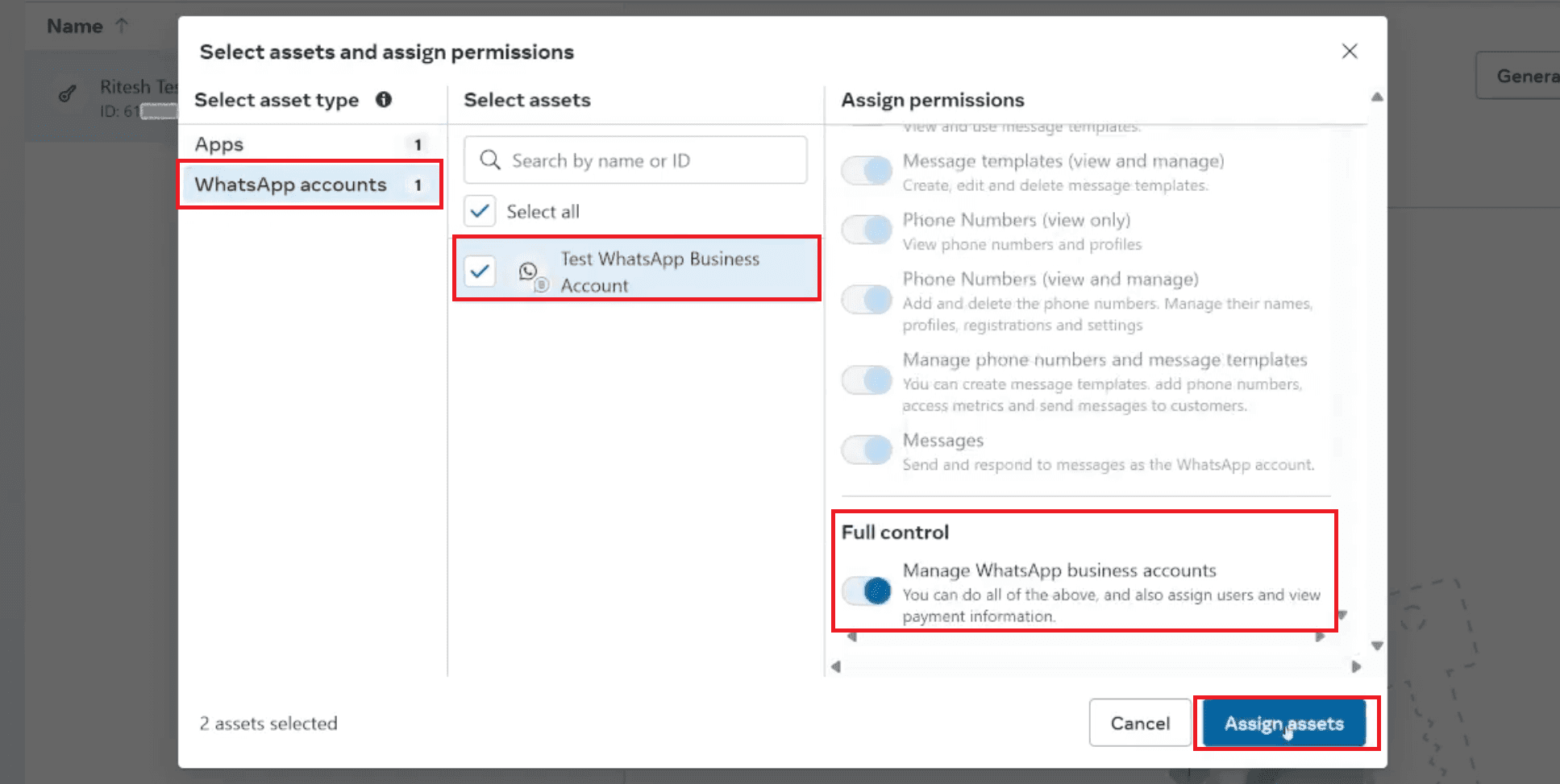 Assign WABA Control: Select your Test WhatsApp Business Account from the list.