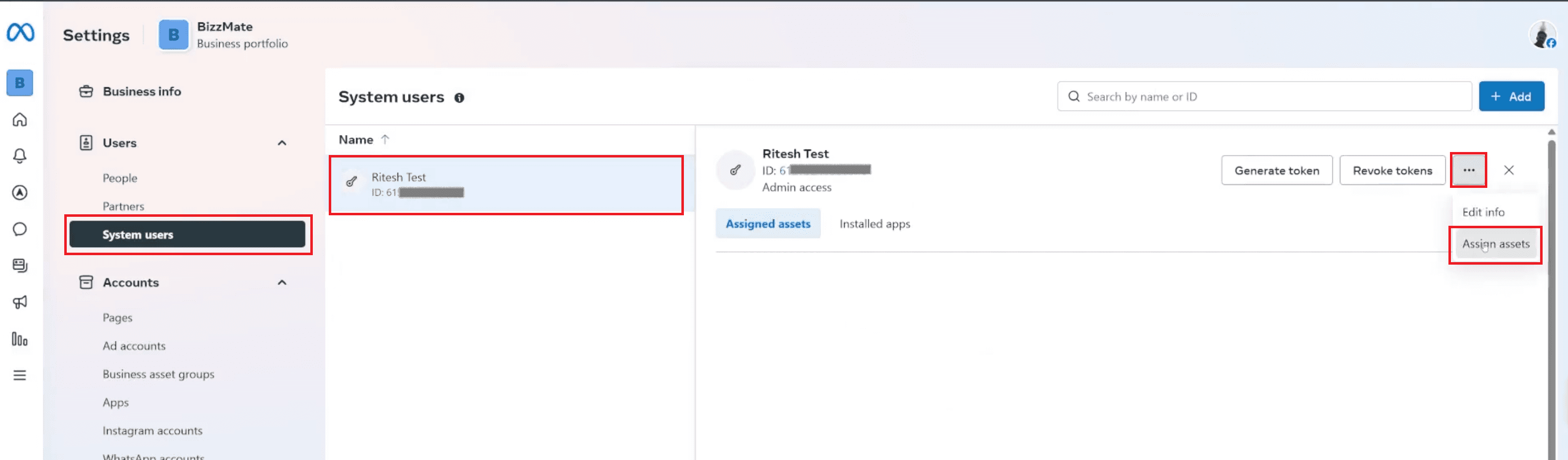 Navigate to Business Settings: Go to Meta Business Settings and find the System users section under Users.